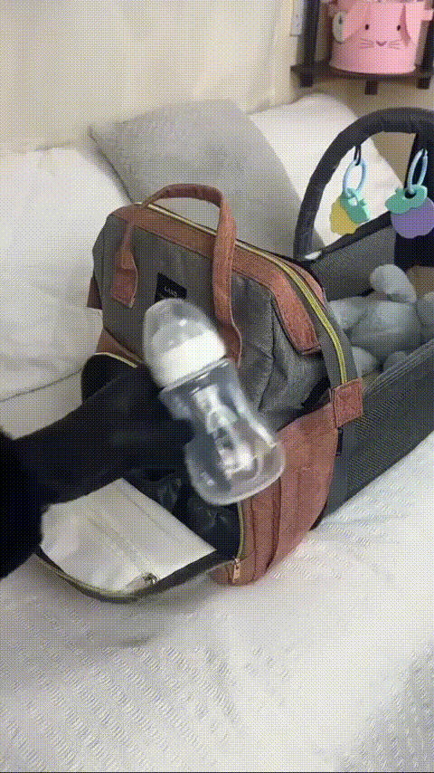 All-in-one diaper bag with a built-in portable crib , ideal for outings and travel. Made from high-quality, safe, and chemical-free cotton 🌱. Its large size offers ample space for diapers, bottles, and accessories, while the zipper closure keeps everything secure 🔒.